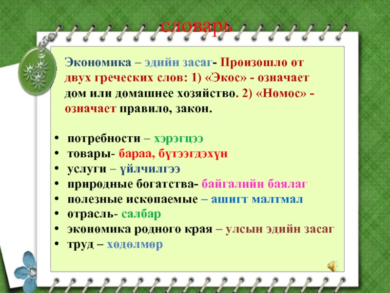 Экономика – эдийн засаг- Произошло от двух греческих слов: 1) «Экос» - означает дом или домашнее хозяйство. 2) «Номос» - означает правило, закон.