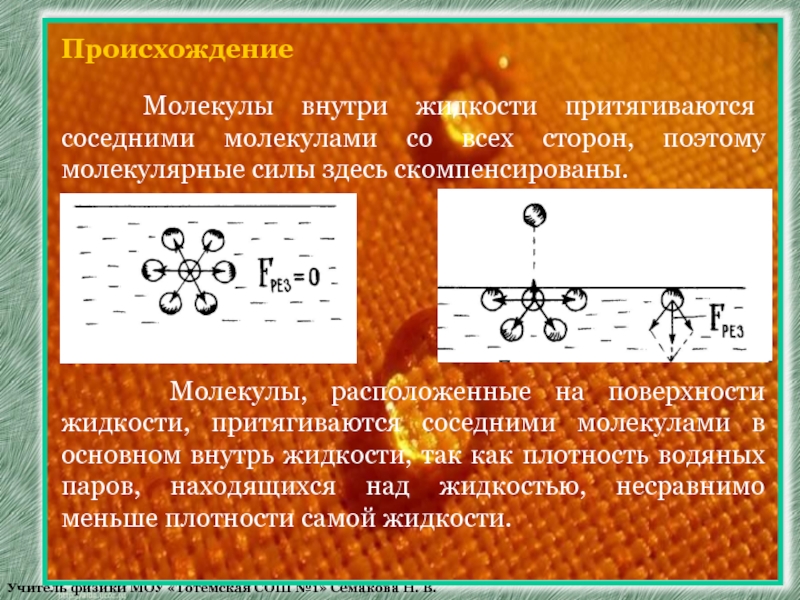 Если жидкость медленно вытекает из пипетки, то на ее нижнем конце образуется капля. Капля отрывается после того, как сила тяжести, действующая на каплю, сравняется с силой поверхностного нятяжения, которая также действует на каплю вдоль длины окружности конца пипетки.
