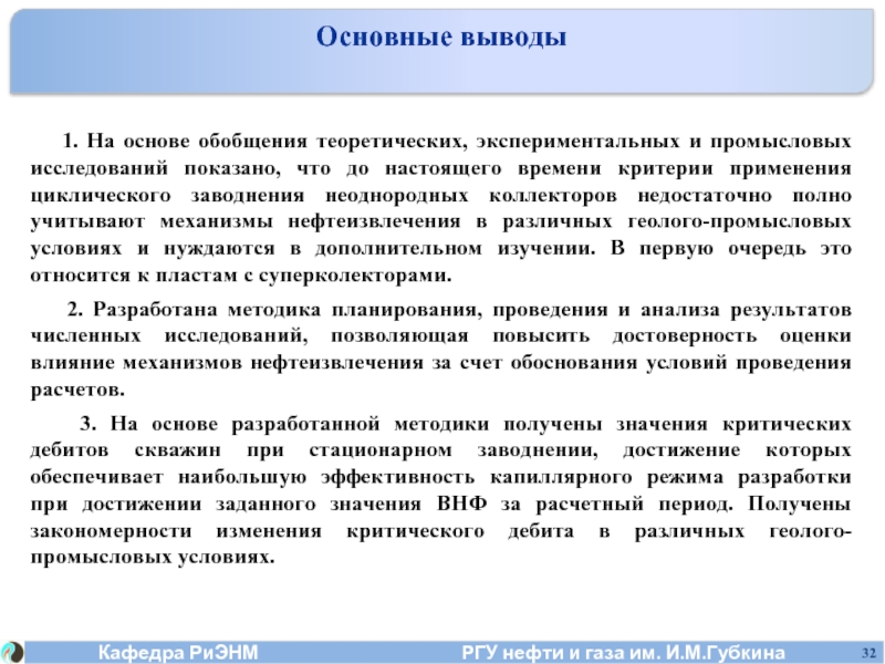 Теоретические исследования - проведены на двухслойных моделях с заданием функции обмена, которая явно не зависит от совокупности природных факторов (обоснование продолжительности периодов проводится при различной годовой закачке в вариантах, что некорректно).