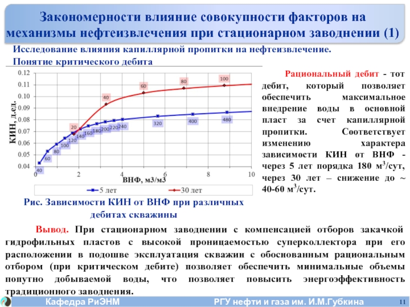 Рациональный дебит - тот дебит, который позволяет обеспечить максимальное внедрение воды в основной пласт за счет капиллярной пропитки. Соответствует изменению характера зависимости КИН от ВНФ - через 5 лет порядка 180 м3/сут, через 30 лет – снижение до ~ 40-60 м3/сут.