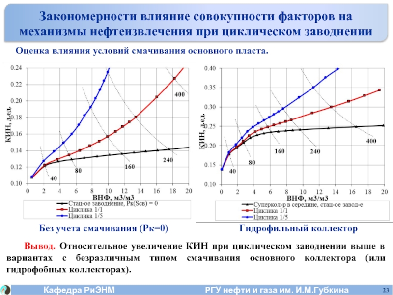 Вывод. Относительное увеличение КИН при циклическом заводнении выше в вариантах с безразличным типом смачивания основного коллектора (или гидрофобных коллекторах).