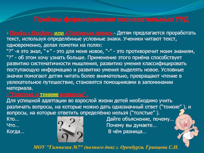 - Приём « Инсёрт» или «Условные значки - Детям предлагается проработать текст, используя определённые условные знаки. Ученики читают текст, одновременно, делая пометки на полях: