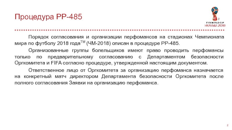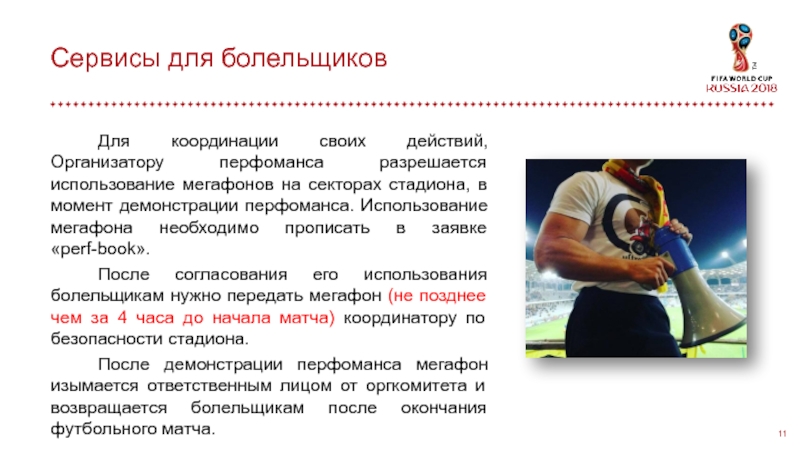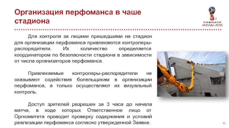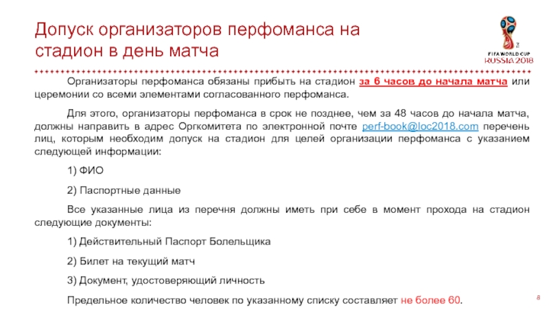 Внимание: Перфомансы при входе на стадион будут проверяться на противопожарную безопасность, в связи с чем необходимо самостоятельно проводить огнезащиту тканей противопожарным составом. Перфомансы, не прошедшие противопожарную проверку, не будут допущены на стадион. / Note: Performances at the entrance to the stadium will be checked for fire safety, in this connection it is necessary to conduct fire protection of fabrics by fire retardant independently. Performances that did not pass the fire inspection, will not be allowed to the stadium.