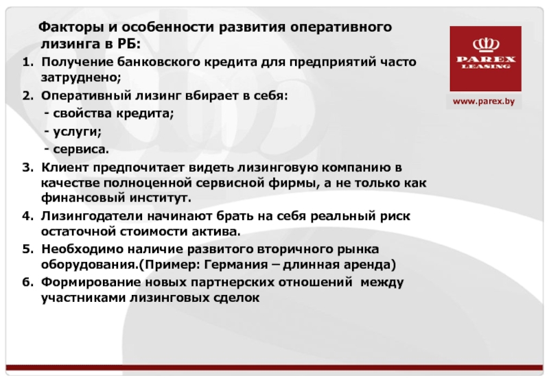 Факторы и особенности развития оперативного лизинга в РБ: