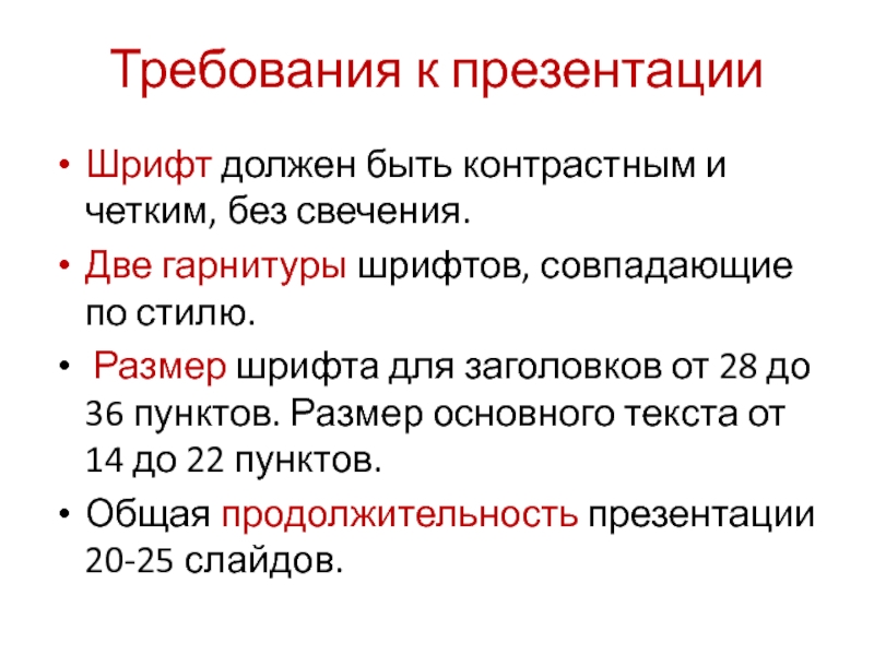 Размер шрифта для заголовков от 28 до 36 пунктов. Размер основного текста от 14 до 22 пунктов.
