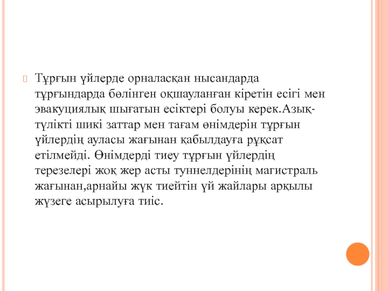 Слайд 5Тұрғын үйлерде орналасқан нысандарда тұрғындарда бөлінген оқшауланған кіретін есігі мен эвакуциялық