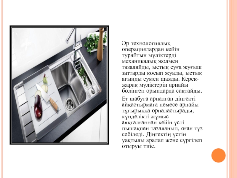 ыстық суға жуғыш заттарды қосып жуады, ыстық ағынды сумен шаяды. Керек-жарақ мүліктерін арнайы бөлінген орындарда сақтайды.