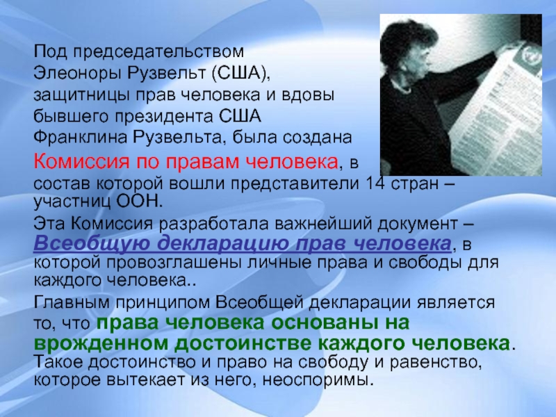 Эта Комиссия разработала важнейший документ – Всеобщую декларацию прав человека, в которой провозглашены личные права и свободы для каждого человека..