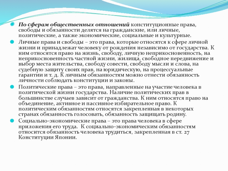 Слайд 4По сферам общественных отношений конституционные права, свободы и обязанности делятся на гражданские,