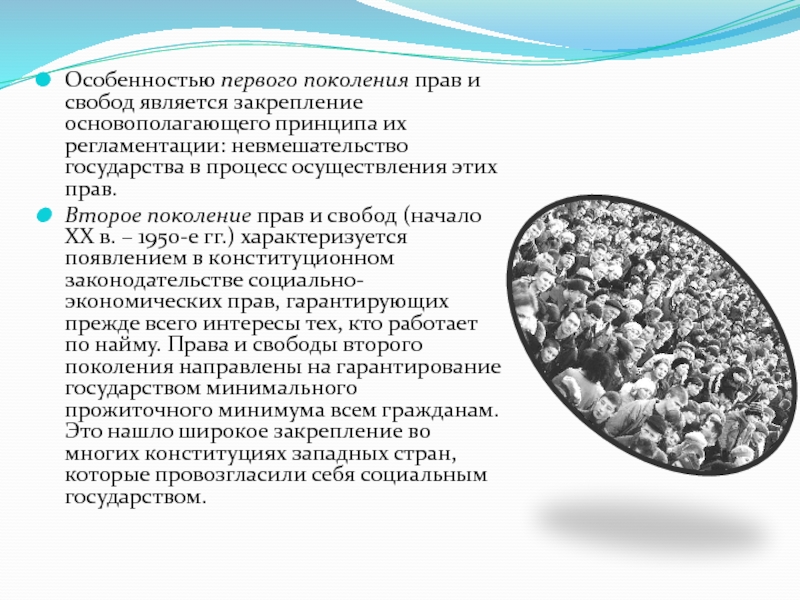 Второе поколение прав и свобод (начало ХХ в. – 1950-е гг.) характеризуется появлением в конституционном законодательстве социально-экономических прав, гарантирующих прежде всего интересы тех, кто работает по найму. Права и свободы второго поколения направлены на гарантирование государством минимального прожиточного минимума всем гражданам. Это нашло широкое закрепление во многих конституциях западных стран, которые провозгласили себя социальным государством.