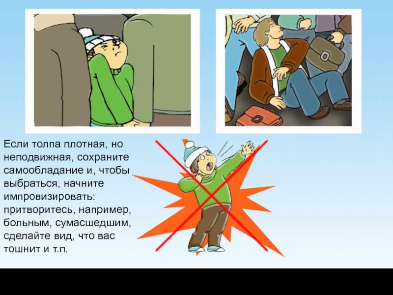 Слайд 14Если толпа плотная, но неподвижная, сохраните самообладание и, чтобы выбраться, начните