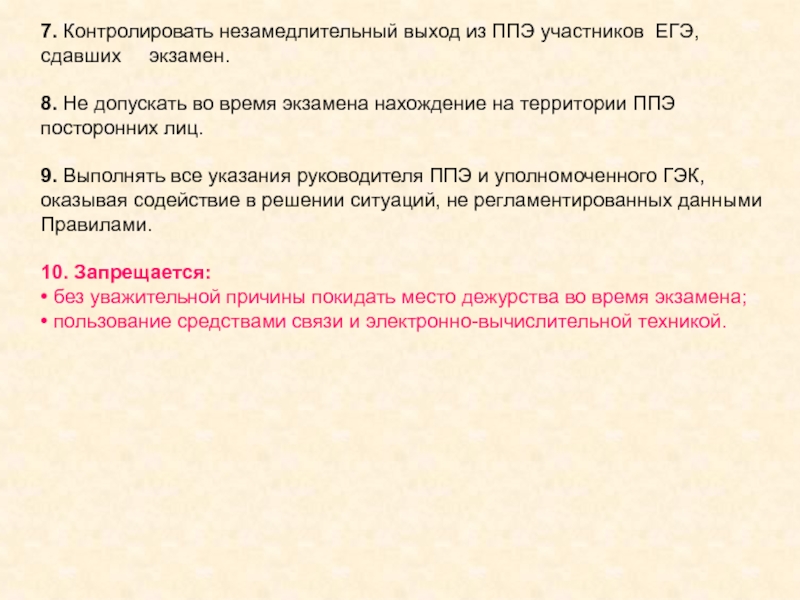 6. Обеспечивать вход в ППЭ представителей СМИ, общественных наблюдателей, должностных лиц ОИВ, Рособрнадзора, осуществляющих выездную проверку соблюдения установленного порядка проведения ЕГЭ, при этом проверять наличие у них документа, удостоверяющего личность, и документа, подтверждающего их полномочия.