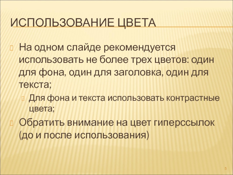 На одном слайде рекомендуется использовать не более трех цветов: один