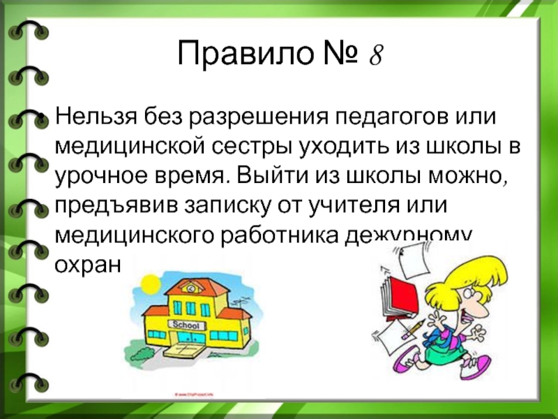 школы в урочное время. Выйти из школы можно, предъявив записку от учителя или медицинского работника дежурному охраннику.