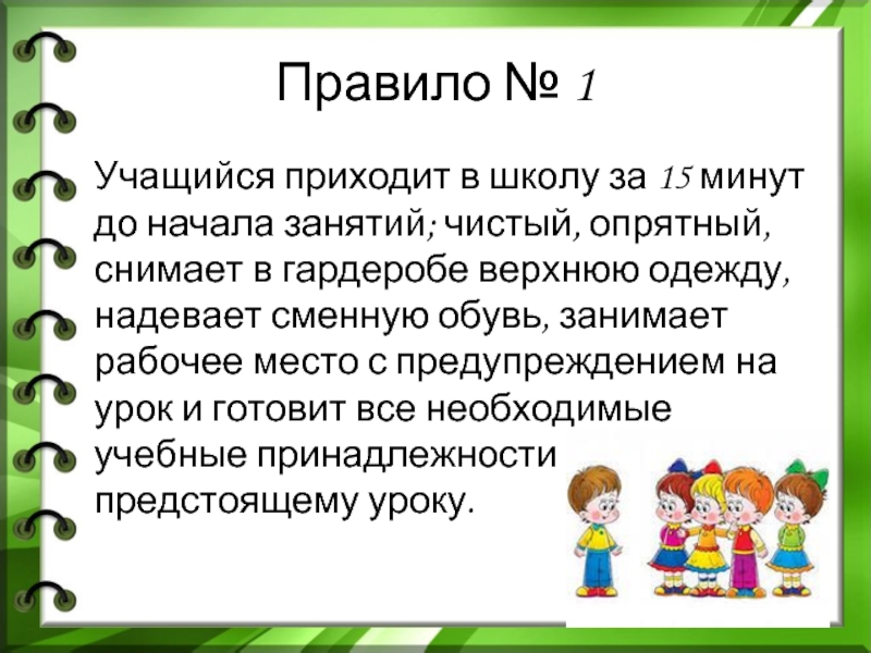 занятий; чистый, опрятный, снимает в гардеробе верхнюю одежду, надевает сменную обувь, занимает рабочее место с предупреждением на урок и готовит все необходимые учебные принадлежности к предстоящему уроку.