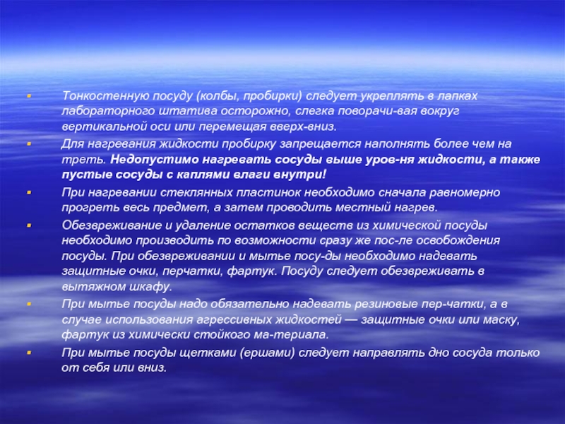 Слайд 10Стеклянную посуду (тонкостенные химические стаканы и колбы из обычного стекла) запрещается