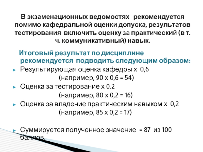В экзаменационных ведомостях рекомендуется помимо кафедральной оценки допуска, результатов тестирования включить оценку за практический (в т.ч. коммуникативный) навык.