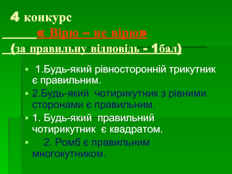 2.Будь-який чотирикутник з рівними сторонами є правильним.