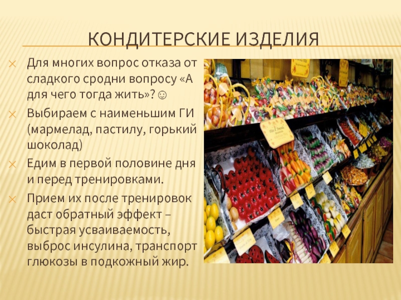 Выбираем с наименьшим ГИ (мармелад, пастилу, горький шоколад)