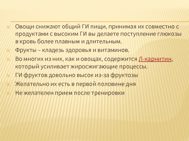 Слайд 17Овощи снижают общий ГИ пищи, принимая их совместно с продуктами с