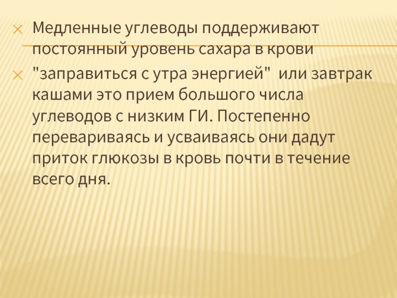 Слайд 7Медленные углеводы поддерживают постоянный уровень сахара в крови