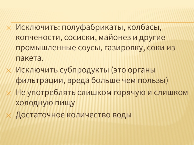 Слайд 24Исключить: полуфабрикаты, колбасы, копчености, сосиски, майонез и другие промышленные соусы, газировку,