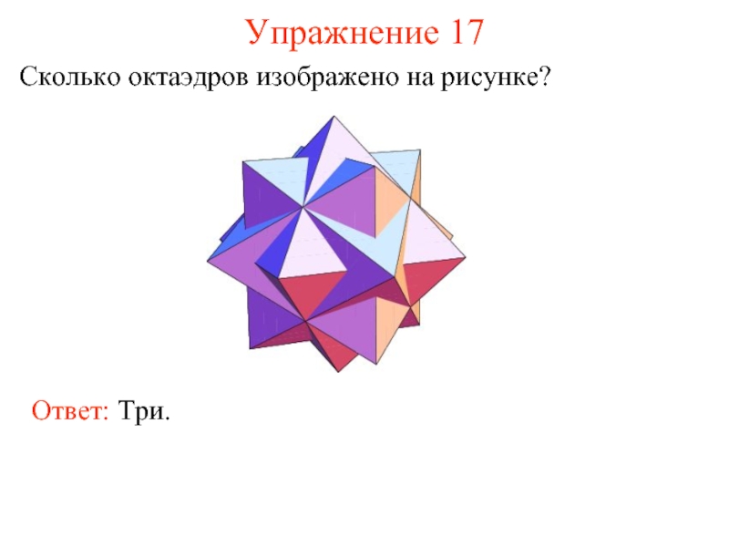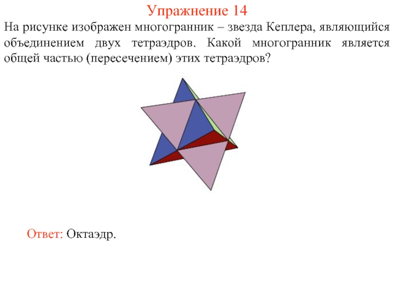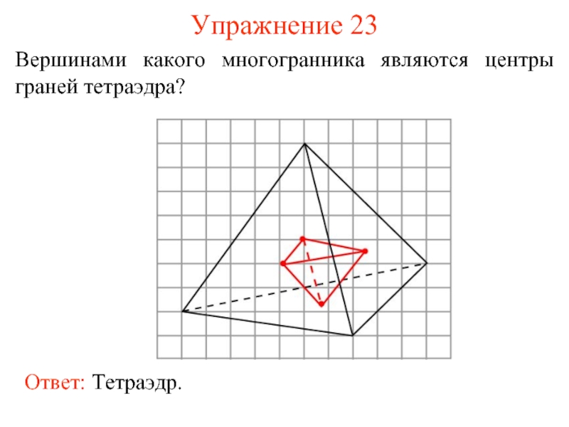 Названия многогранников тоже имеют древнегреческое происхождение. В переводе с греческого: "Тетра" - четыре; "Гекса" - шесть; "Окто" - восемь; "Икоси" - двадцать, "Додека" - двенадцать. "Эдра" - грань.