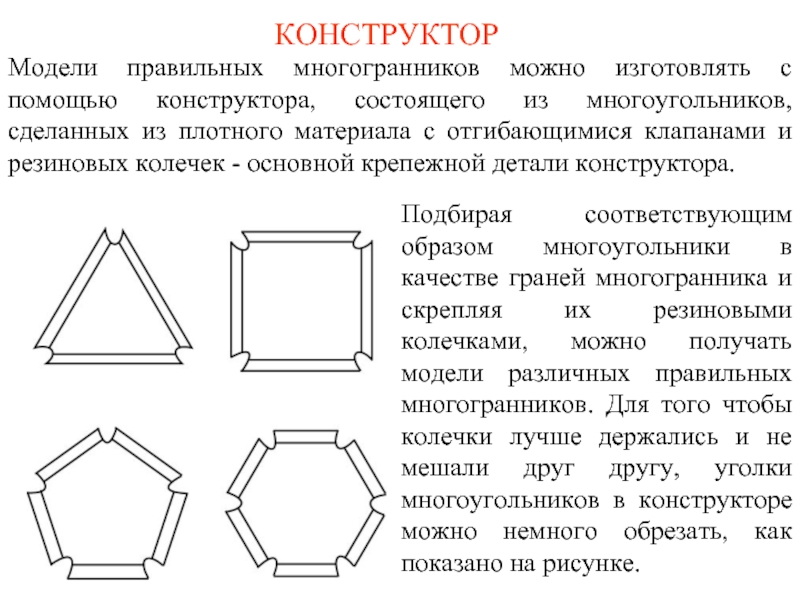 Подбирая соответствующим образом многоугольники в качестве граней многогранника и скрепляя их резиновыми колечками, можно получать модели различных правильных многогранников. Для того чтобы колечки лучше держались и не мешали друг другу, уголки многоугольников в конструкторе можно немного обрезать, как показано на рисунке.