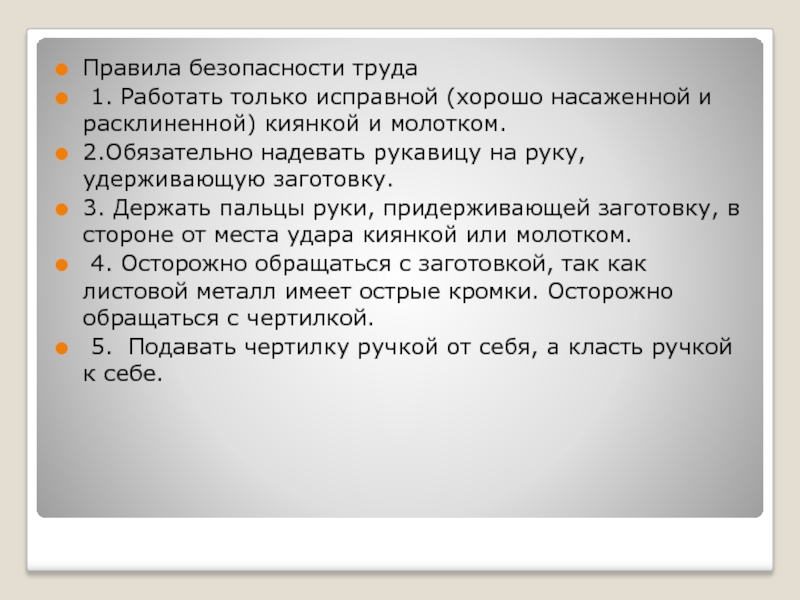 3. Держать пальцы руки, придерживающей заготовку, в стороне от места удара киянкой или молотком.