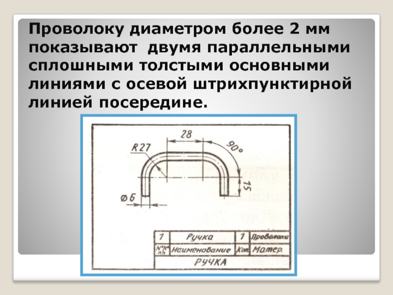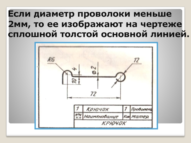 Слайд 7Если диаметр проволоки меньше 2мм, то ее изображают на чертеже сплошной