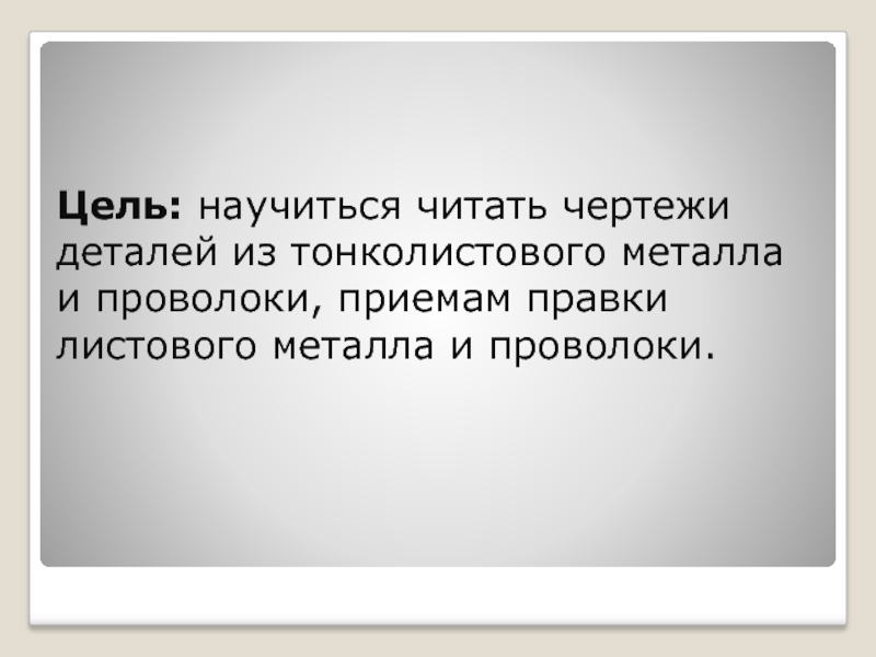 Слайд 4Цель: научиться читать чертежи деталей из тонколистового металла и проволоки, приемам