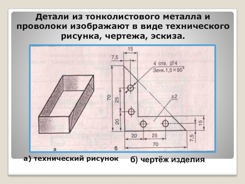 Слайд 5Детали из тонколистового металла и проволоки изображают в виде технического рисунка,