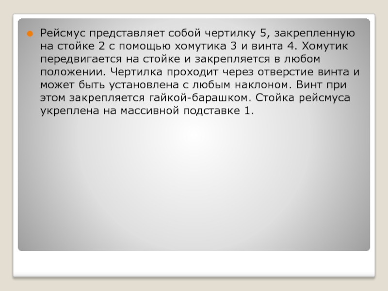хомутика 3 и винта 4. Хомутик передвигается на стойке и закрепляется в любом положении. Чертилка проходит через отверстие винта и может быть установлена с любым наклоном. Винт при этом закрепляется гайкой-барашком. Стойка рейсмуса укреплена на массивной подставке 1.
