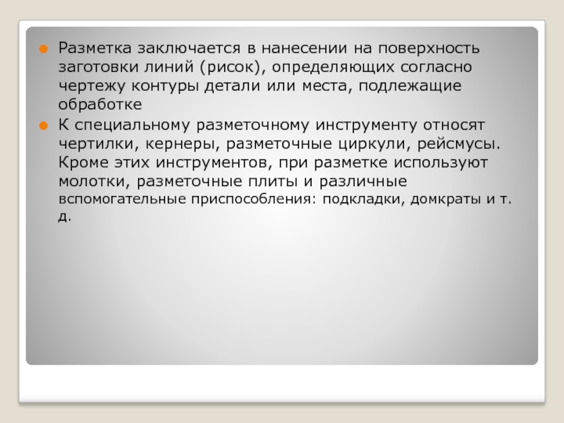 Разметка заключается в нанесении на поверхность заготовки линий (рисок), определяющих согласно