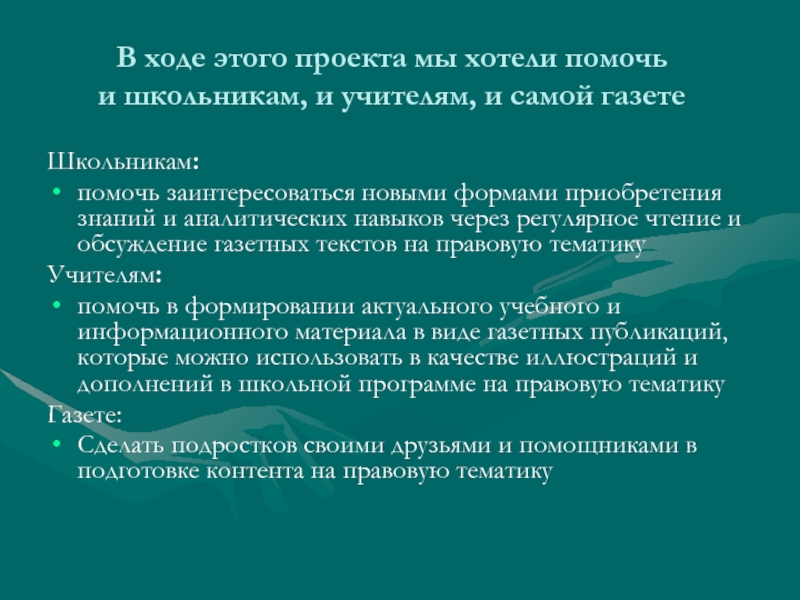 помочь в формировании актуального учебного и информационного материала в виде газетных публикаций, которые можно использовать в качестве иллюстраций и дополнений в школьной программе на правовую тематику