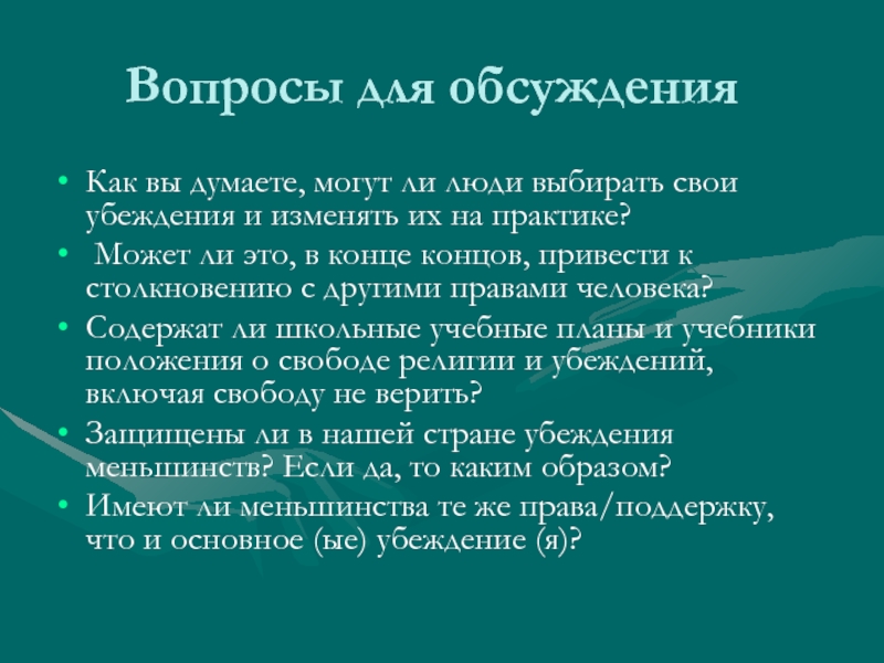 В международных документах термин убеждение также используется для обозначения прав неверующих людей, таких как атеисты (вера в отсутствие божества), агностики (не уверены в существовании Бога) и рационалисты. Убеждения другого рода – политические, культурные, научные или экономические – не подпадают под эту защиту и о них необходимо вести речь отдельно.