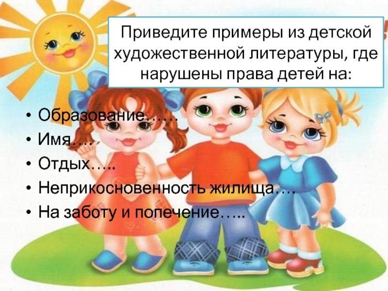 Слайд 12Приведите примеры из детской художественной литературы, где нарушены права детей на: