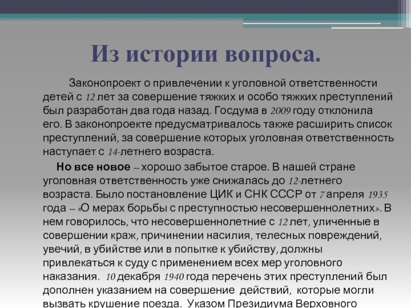 Но все новое – хорошо забытое старое. В нашей стране уголовная ответственность уже снижалась до 12-летнего возраста. Было постановление ЦИК и СНК СССР от 7 апреля 1935 года – «О мерах борьбы с преступностью несовершеннолетних». В нем говорилось, что несовершеннолетние с 12 лет, уличенные в совершении краж, причинении насилия, телесных повреждений, увечий, в убийстве или в попытке к убийству, должны привлекаться к суду с применением всех мер уголовного наказания. 10 декабря 1940 года перечень этих преступлений был дополнен указанием на совершение действий, которые могли вызвать крушение поезда. Указом Президиума Верховного Совета СССР от 31 января 1941 года возраст привлечения к уголовной ответственности за все прочие преступления был определен в 14 лет.