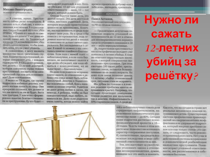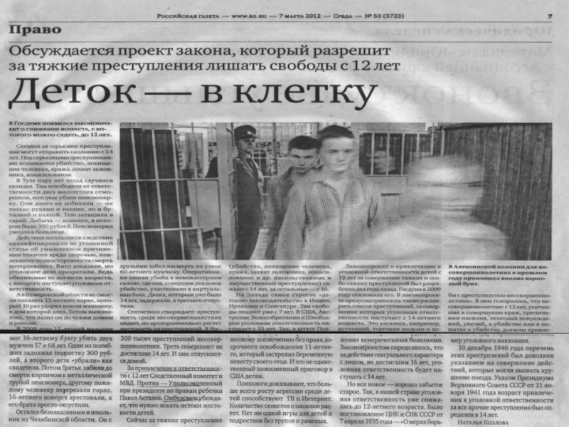 статья под названием «Деток – в клетку» с подзаголовком «Обсуждается проект закона, который разрешит за тяжкие преступления лишать свободы с 12 лет».