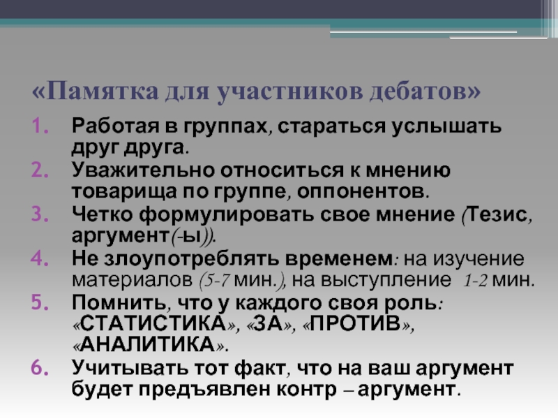 Помнить, что у каждого своя роль: «СТАТИСТИКА», «ЗА», «ПРОТИВ», «АНАЛИТИКА».