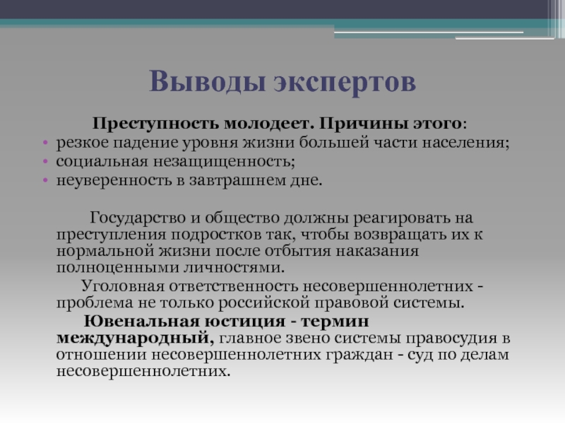 Государство и общество должны реагировать на преступления подростков так, чтобы возвращать их к нормальной жизни после отбытия наказания полноценными личностями.