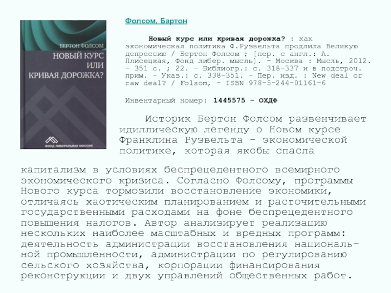 капитализм в условиях беспрецедентного всемирного экономического кризиса. Согласно Фолсому, программы Нового курса тормозили восстановление экономики, отличаясь хаотическим планированием и расточительными государственными расходами на фоне беспрецедентного повышения налогов. Автор анализирует реализацию нескольких наиболее масштабных и вредных программ: деятельность администрации восстановления националь-ной промышленности, администрации по регулированию сельского хозяйства, корпорации финансирования реконструкции и двух управлений общественных работ.