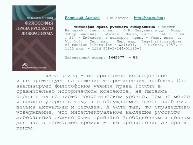 «Эта книга – историческое исследование и не претендует на решение теоретических проблем. Она анализирует философские учения права России в сравнительно-историческом контексте, не пытаясь оценить их на чисто теоретическом уровне. Тем не менее я вполне уверен в том, что обсуждаемые здесь проблемы весьма актуальны и сегодня. А если так, то справедливо утверждение, что интеллектуальное наследие русского либерализма должно быть признано злободневным и ценным для нас в настоящее время» - из предисловия автора к книге.