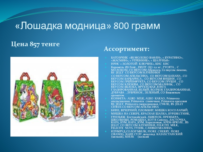 ИЗУМРУД ,СОЛОР МИЛК, СОЛОР САСАО, FIORE CHERRY, FIORE ORANDG, БАЯН СУЛУ ,шоколад КАЗАХСТАНСКИЙ (мелкий), МИЛК (мелкий)