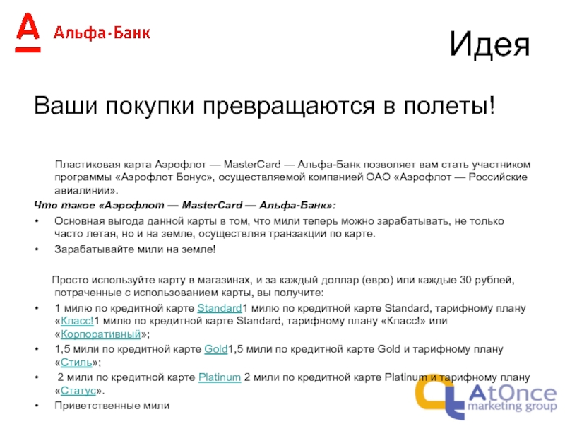Аэрофлот — MasterCard — Альфа-Банк позволяет вам стать участником программы «Аэрофлот Бонус», осуществляемой компанией ОАО «Аэрофлот — Российские авиалинии».