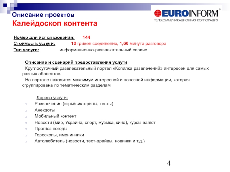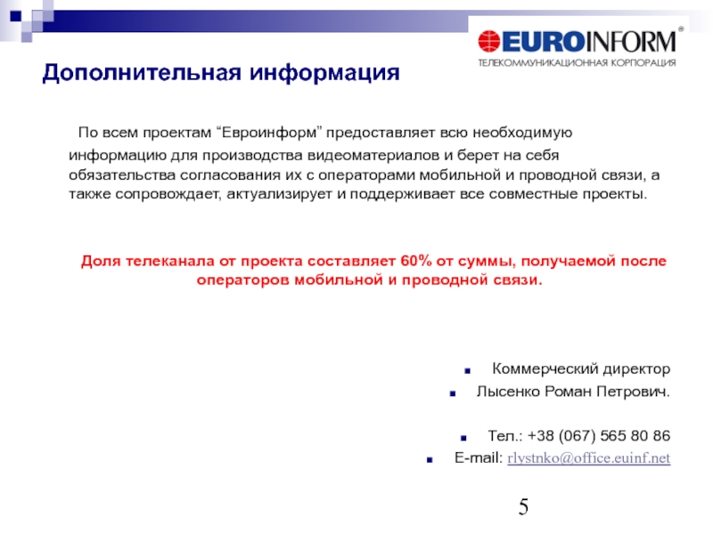 видеоматериалов и берет на себя обязательства согласования их с операторами мобильной и проводной связи, а также сопровождает, актуализирует и поддерживает все совместные проекты.