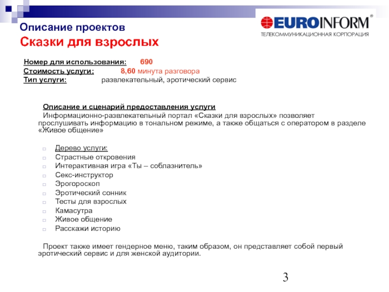 Информационно-развлекательный портал «Сказки для взрослых» позволяет прослушивать информацию в тональном режиме, а также общаться с оператором в разделе «Живое общение»