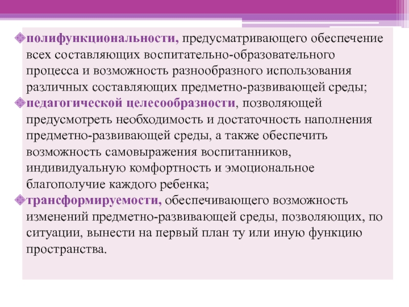 Слайд 7полифункциональности, предусматривающего обеспечение всех составляющих воспитательно-образовательного процесса и возможность разнообразного использования