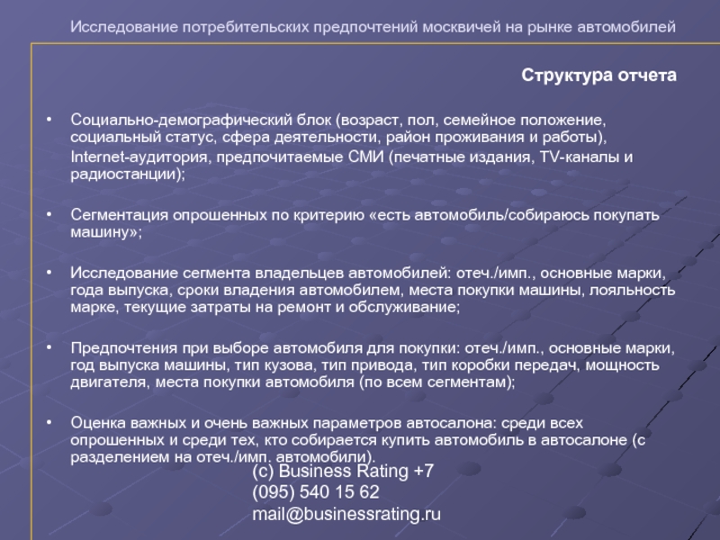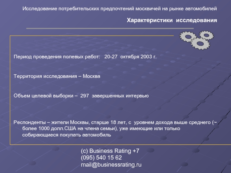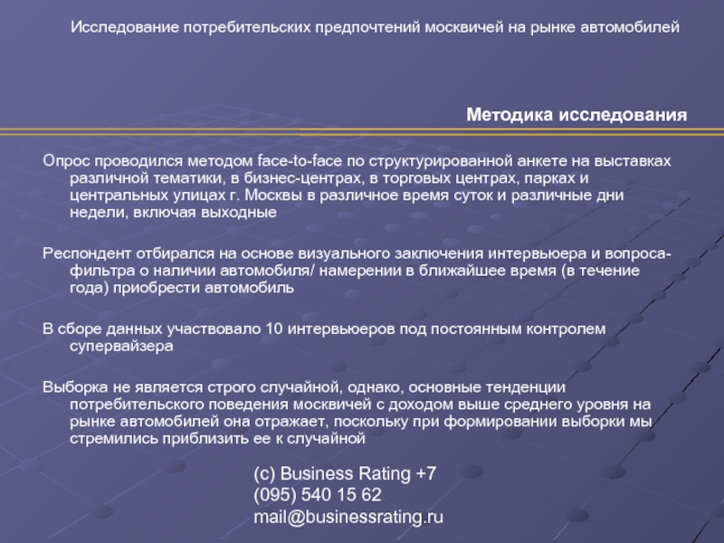 Респонденты – жители Москвы, старше 18 лет, c уровнем дохода выше среднего (~ более 1000 долл.США на члена семьи), уже имеющие или только собирающиеся покупать автомобиль