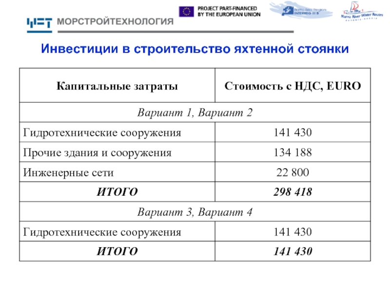 Вариант 1 учитывает инвестиции во все объекты яхтенной стоянки (образование территории, гидротехнические сооружения и работы, здания и сооружения), все доходы и расходы, связанные с этими объектами строительства. Максимальная загрузка по данному варианту составит 100% и будет достигнута к 2014 году.